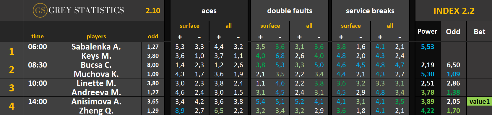 Zapraszamy na codzienną dawkę statystyk dotyczących asów serwisowych, podwójnych błędów i przełamań w spotkaniach ATP & WTA Tour autorstwa Grey Statistics. W tabelach znajdziecie średnie liczby z sezonu, które powinny Wam pomóc i skrócić analizę spotkań pod tym kątem.
