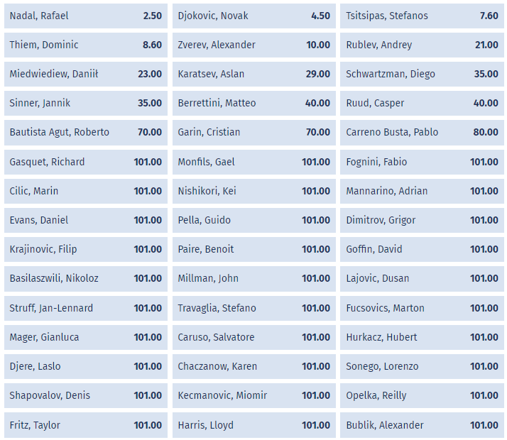 Największe szanse na podniesienie pucharu za zwycięstwo bukmacherzy dają Rafaelowi Nadalowi. Za nim znajdują się: Novak Djokovic, Stefanos Tsitsipas, Dominic Thiem i Alexander Zverev. Ciekawie prezentują się także kursy obok nazwisk Matteo Berrettiniego i Caspera Ruuda.