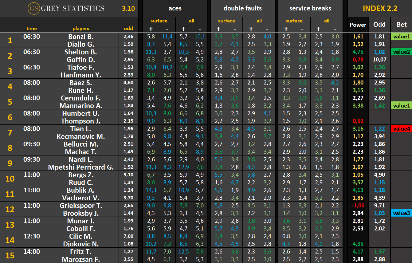 Bet – jeśli kursy wystawione z pomocą indeksów są opłacalne względem kursów u bukmachera, w tej kolumnie pojawi się wartość “value” wraz z cyfrą (im wyższa, tym większe value)