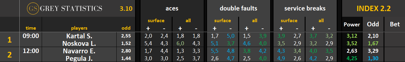 Zapraszamy na codzienną dawkę statystyk dotyczących asów serwisowych, podwójnych błędów i przełamań w spotkaniach ATP & WTA Tour autorstwa Grey Statistics. W tabelach znajdziecie średnie liczby z sezonu, które mogą pomóc w analizie i doborze typów na dany mecz.